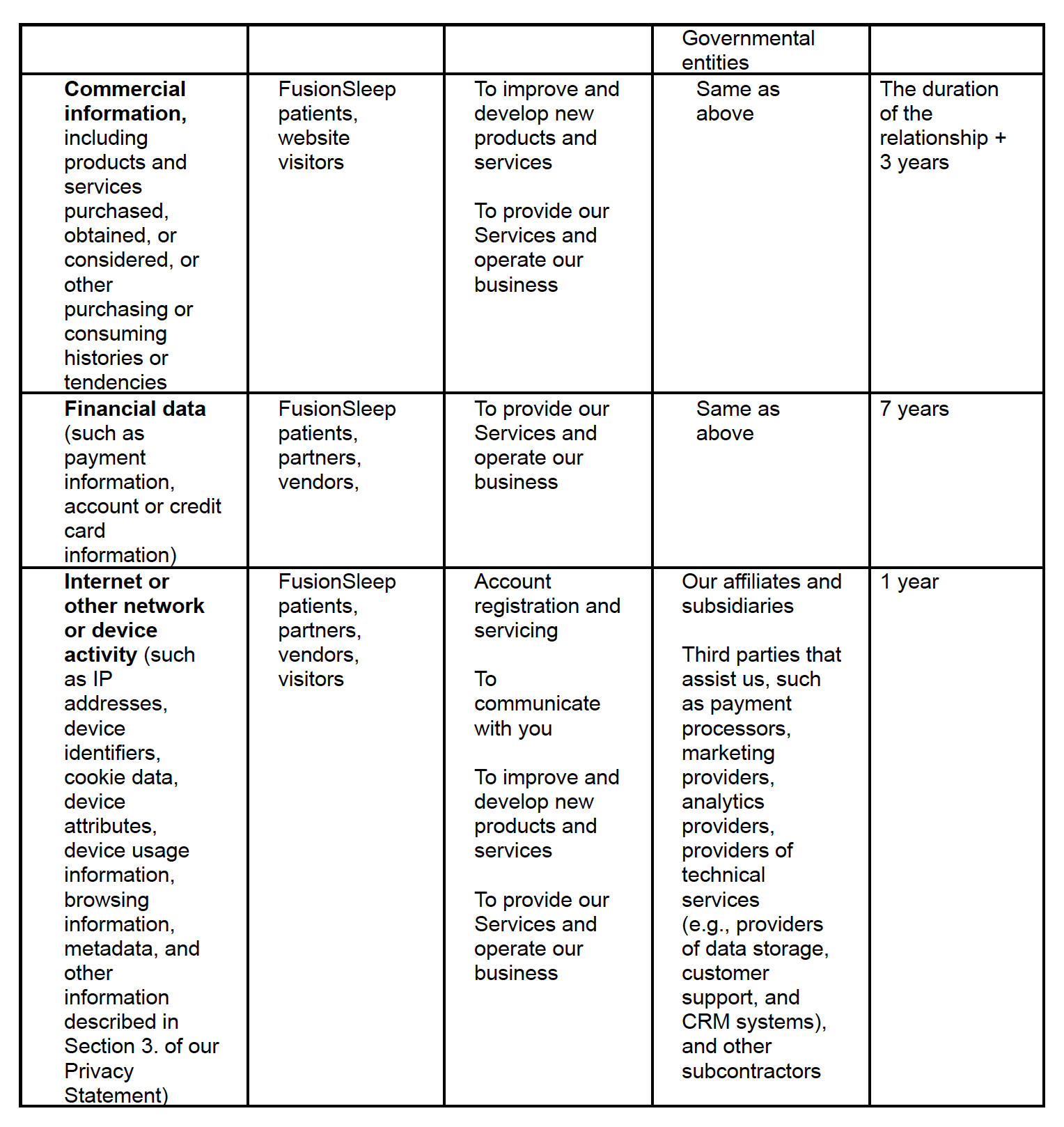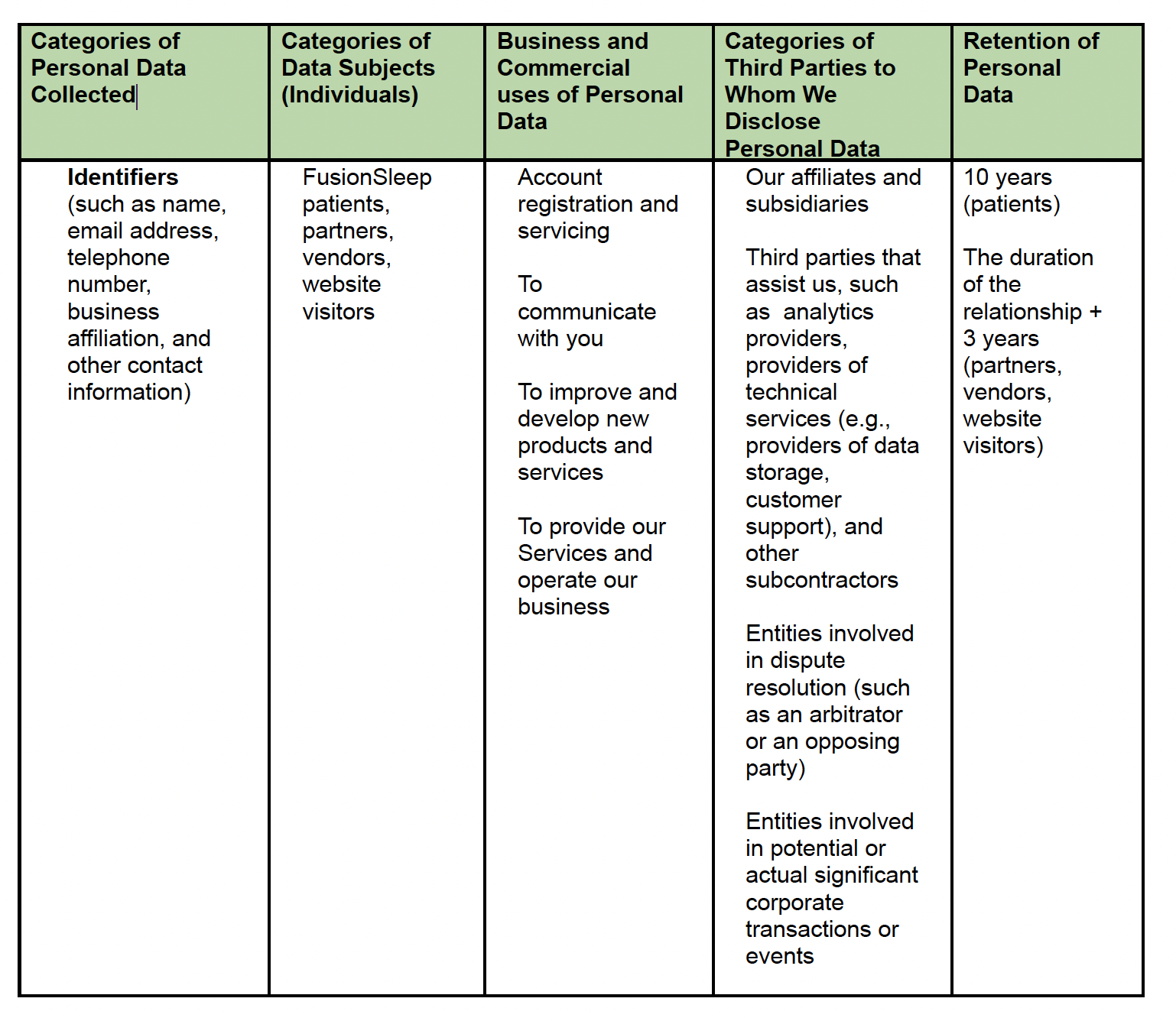This Privacy Notice applies to the FusionSleep Websites and services provided through those sites. This Notice is incorporated into and is a part of the terms of use of the FusionSleep Website (the “Terms of Use”). We encourage you to review both this Notice and the Terms of Use. When used in this Notice, “personal data” means any information that identifies, relates to, describes, is reasonably capable of being associated with, or could reasonably be linked, directly or indirectly, with an individual (“data subject”), and includes “personal data” or “personal information” as defined in applicable data protection laws. Data that cannot be associated with you, such as aggregated, de-identified, or anonymized information (“Anonymous Information”), is not personal data. FusionSleep commits to keep Anonymous Information in its de-identified state, and will make no efforts to re-identify such data. This Notice does not apply to Protected Health Information (“PHI”) as defined in the Health Insurance Portability and Accountability Act of 1996 and its implementing regulations, as amended (“HIPAA”). For information regarding how we collect, use, and disclose PHI that we receive as a covered entity under HIPAA, please see our Notice of Privacy Practices. We may also maintain your PHI on behalf of other third parties subject to HIPAA, including, for example, health plans, physicians, or medical facilities who are our business partners or customers. Where we maintain your PHI on behalf of any third party subject to HIPAA, we will maintain that information in accordance with the applicable Business Associate Agreement that FusionSleep may enter into with each third party. By accessing and using the FusionSleep Website, or any part thereof, you agree that you have read and understand this Privacy Notice, and that in exchange for access to the FusionSleep Website and Services provided through the site, you accept and consent to the privacy practices described in this Notice.
